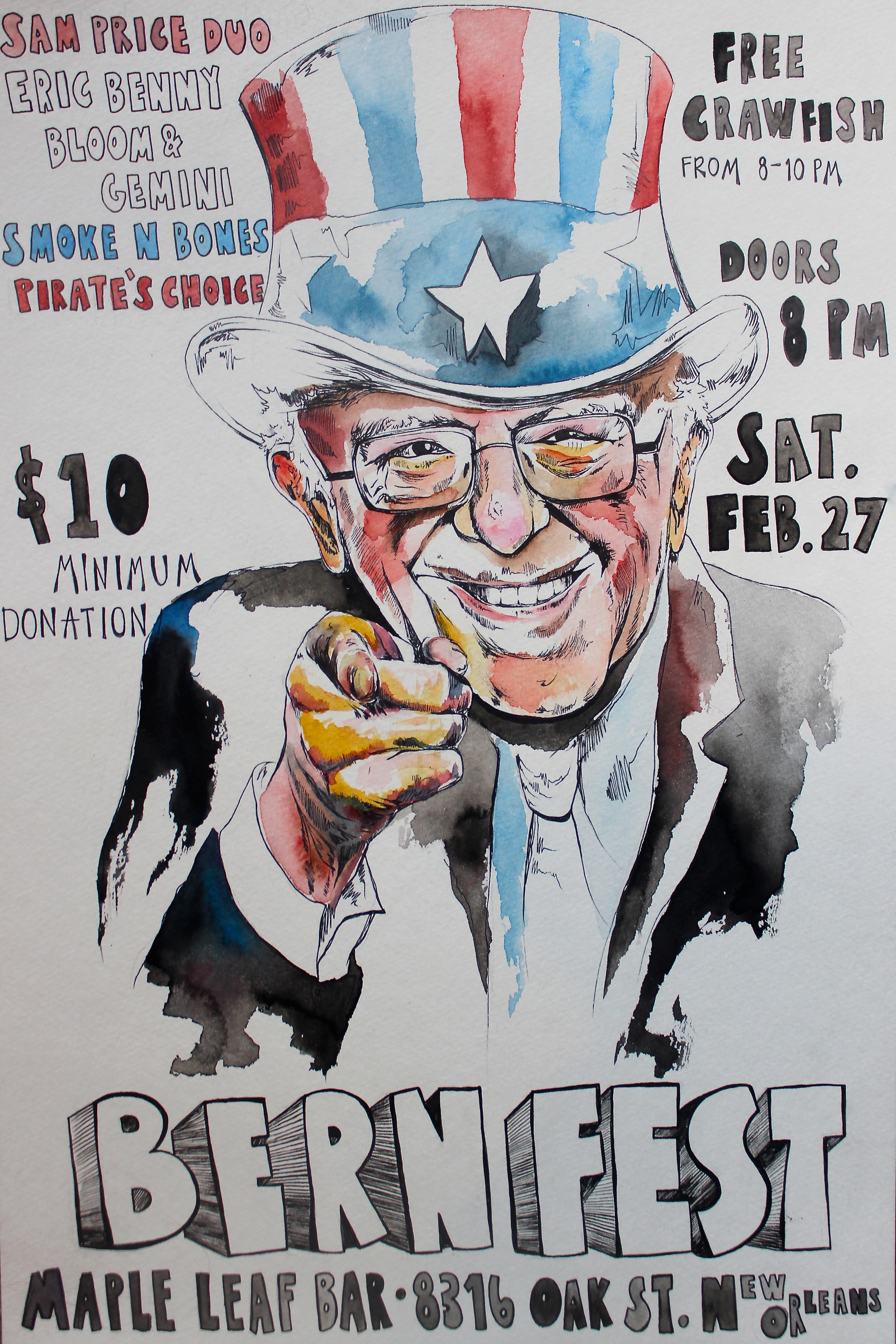 “I wanted to do something more than post on Facebook and give my $10 donations periodically,” he continues. “In speaking with Billy Franklin and Eric Bloom, we decided to put on a benefit concert to raise money and awareness for the campaign. Paulina Trujillo was kind enough (and also feeling the Bern!) to let us do it at one of our favorite places, the Maple Leaf. It turns out to be on a national day of action and we are joined by two other events in New Orleans on the same day, a March for Bernie and a Rally on Frenchmen St. It will be a great day!”