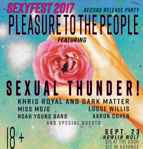 Sexual Thunder! will headline the event, supported by a collection of up-and-coming musical acts. New Orleans-native and prolific creator Khris Royal and Dark Matter will perform. On the heels of high-profile supporting shows in town, freak jazz space rock outfit Loose Willis will perform all original music. The female-fronted r&b band Miss Mojo will the stage, along with the Noah Young Trio (Naughty Professor) and singer-songwriter Aaron Cohen. Special musical guests will be announced closer to the event.