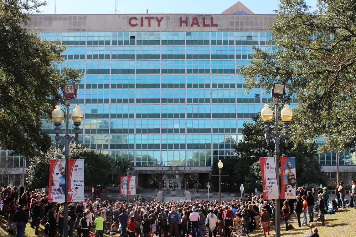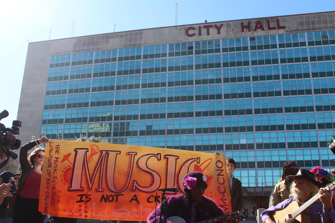 A rally organized by the Music & Culture Coalition of New Orleans (MaCCNO) in Duncan Plaza in front of City Hall today began at 11 a.m.—New Orleans time. The diverse, congenial crowd was jubilant over last night’s news that the City Council had deferred a hearing on the proposed sound ordinance that precipitated the gathering.
