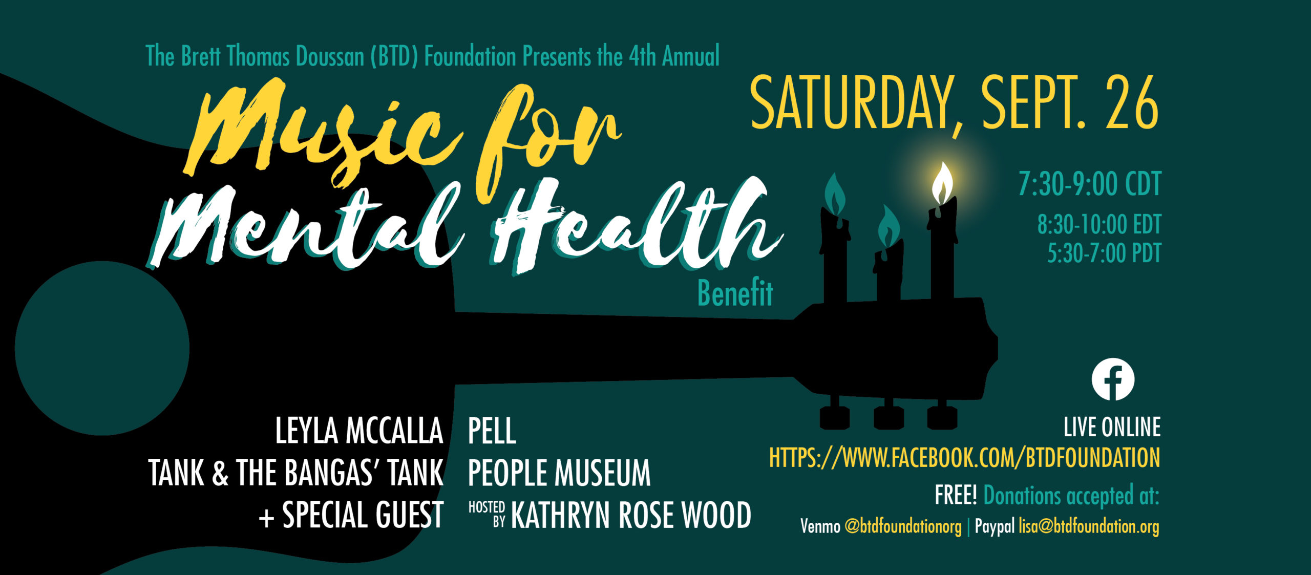 Founded and hosted by musician and mental-health advocate Kathryn Rose Wood, Music for Mental Health is presented by the Brett Thomas Doussan Foundation, an organization which works to raise awareness for mental health through education, advocacy and music.