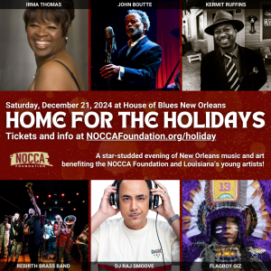 The NOCCA Foundation, in collaboration with the family of Daniel Price, is proud to celebrate the 20th anniversary of “Home for the Holidays” on Saturday, December 21, 2024, at the House of Blues New Orleans, from 6:30 p.m. – midnight. The milestone event features a spectacular lineup of New Orleans legends, including Irma Thomas, Rebirth Brass Band, Kermit Ruffins, John Boutte, DJ Raj Smoove, Flagboy Giz, and Emcee Gralen Banks. Tickets are available now, starting at $79.50, at www.NOCCAFoundation.org/holiday.
