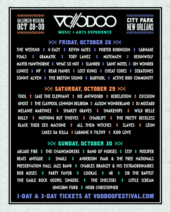 The Voodoo Music + Arts Experience has unveiled the daily lineups for this year’s festival, which returns to City Park October 28-30.