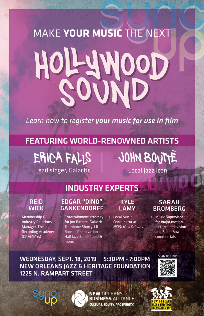 Make Your Music the Next Hollywood Soundtrack is presented by the New Orleans Business Alliance and the New Orleans Jazz & Heritage Foundation and is the third Sync Up workshop they’ve co-hosted. Sync Up workshops aim to provide local musicians with the tools necessary to get paid for their work.