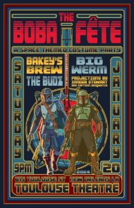 Embark on an immersive intergalactic adventure as Boba Fete: A Space Themed Costume Party makes its cosmic return after the Krewe Of Chewbacchus parade on Saturday, January 20, at The Toulouse Theatre starting at 9:00 p.m. Join the revelry under the cosmic glow as Bakey’s Brew, The Budz and The Big Werm take the stage, ensuring a musical odyssey that resonates throughout the galaxy. Visuals by Xander Stewart, aka Captain Sasquatch, promise to elevate the experience to celestial heights. Be sure to don your most stellar space attire and get ready for a night that transcends the boundaries of time and space. The Intergalactic Krewe of Chewbacchus parade is a sci-fi themed parade that welcomes all super nerds. You can view the parade route here and secure your tickets for this unofficial afterparty here.