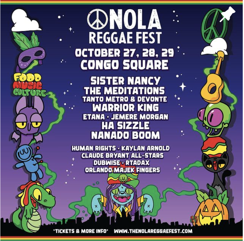 NOLA Reggae Fest returns to Congo Square Friday, October 27 through Sunday, October 29 for three unforgettable days of community celebration featuring live music, dance, and cultural arts demonstrations as well as local food, arts and craft vendors. The festival is a harmonious blend of international reggae artists such as Warrior King and Sister Nancy as well as local artists and DJs to keep you grooving all weekend long. The festivities start Friday afternoon at 2pm at Congo Square which is located at 701 N. Rampart St. For more information about the festival, including information on line-up and how to buy tickets, visit the NOLA Reggae Festival website, here.