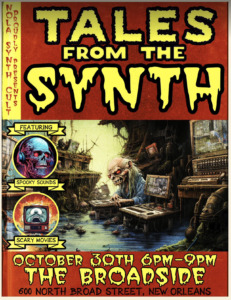 These aren’t just tales from the crypt — they are Broadside’s Tales from the Synth! The Sound design you hear in horror films is just as important as the images you see on the screen. Join some of New Orleans spookiest sound sculptors as they create a live soundtrack to a projection mapped horror movie supercut at The Broadside Theater, 600 N. Broad Street, on Oct. 30 (6-9 p.m.). Featuring vintage synths, modular monsters, and much more, this event is one horror aficionados won’t want to miss. Tickets are $15. Click here for details. If you’re too busy to make this event, don’t fret, they are also hosting their free community show November 1 at Zony Mash Beer Project. Be sure to follow them on Instagram to keep up with all the latest events.