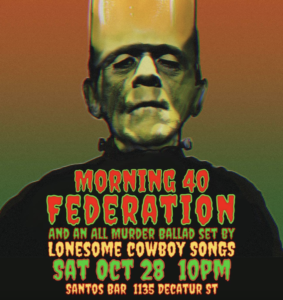 Morning 40 Federation invites you to “carpe the diem’ and join them for a ghoulish Halloween party at Santos on Saturday, October 28. Formed in New Orleans in 1997, this rock band started in the 9th ward of New Orleans at house parties and open mic nights as they grew their following and refined their sound , eventually building popularity throughout the southern United States before releasing four albums. Lonesome Cowboy Songs, will open with a set of all murder ballads that you won’t want to miss. There are a limited number of presale tickets remaining for the Halloween show available here.