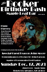 The 14th Annual Booker Birthday Bash takes place on Sunday, December 17, 2023, at the Maple Leaf Bar. This evening features talented piano players such as Tom Worrell, CR Gruver, River Eckert, Kyle Roussel, Luciano Leães, Keiko Komaki, Tom McDermott and Josh Paxton. It will also include special guest Deacon John Moore, remembrances of Booker by John Parsons and master of ceremonies Fred Kasten. Doors open at 7 p.m., and the music kicks off at 8 p.m. Tickets are $15 in advance, $20 at the door and are available online or at the door one hour before the event. You can learn more or purchase your tickets here.