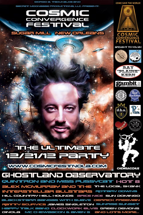 With 12 hours to upend inevitability, 22 bands will crusade for the coming of December 22. These brave warriors include: Ghostland Observatory, Quintron and Miss Pussycat, Alex McMurray and the Interstellar All-Stars, the Hot 8 Brass Band, Rotary Downs, Clockwork Elvis, Derrick Freeman’s Smoker’s World, DiNola, the Local Skank, Ratty Scurvics, the Green Demons, the Blackstarr Bangas and Suave, Woodenhead, the Hill County Hell Hounds, DJ Spyc, James Singleton’s Bluebelly, Sunrise Sunset, MC Trachiotomy, the Happy Talk Band, MC Chewbacon & Amen 5, Sun Domingo, and DJ Brice Nice.