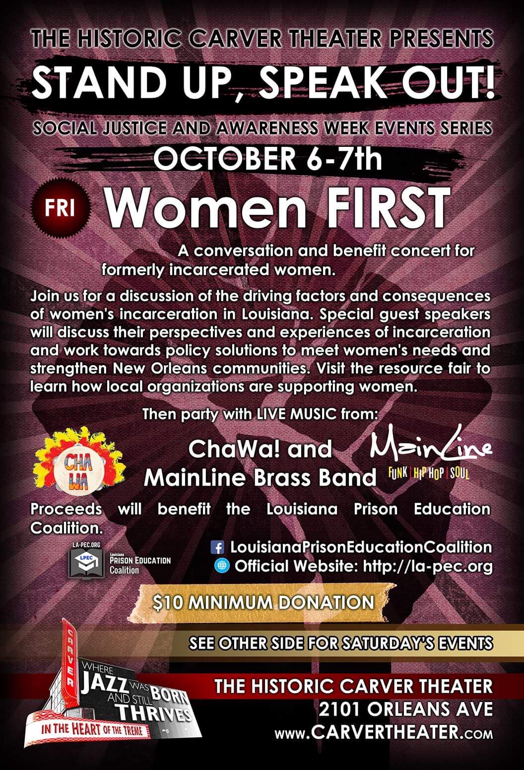 The Historic Carver Theater’s Social Justice and Awareness Week Events Series “Stand Up, Speak Out!” will feature events aimed at raising awareness and fostering conversation about a variety of social and political topics. On October 6, the “Women FIRST” conversation and benefit concert focused on identifying the driving factors and consequences of women’s incarceration in Louisiana, a state often ranking with the highest incarceration rate in the country, will take place. Guest speakers will be in attendance to discuss the topic and lend their hands in developing policy solutions to address the needs of women re-entering society. According to the venue’s website, LaToya Cantrell is scheduled to deliver a seminar.