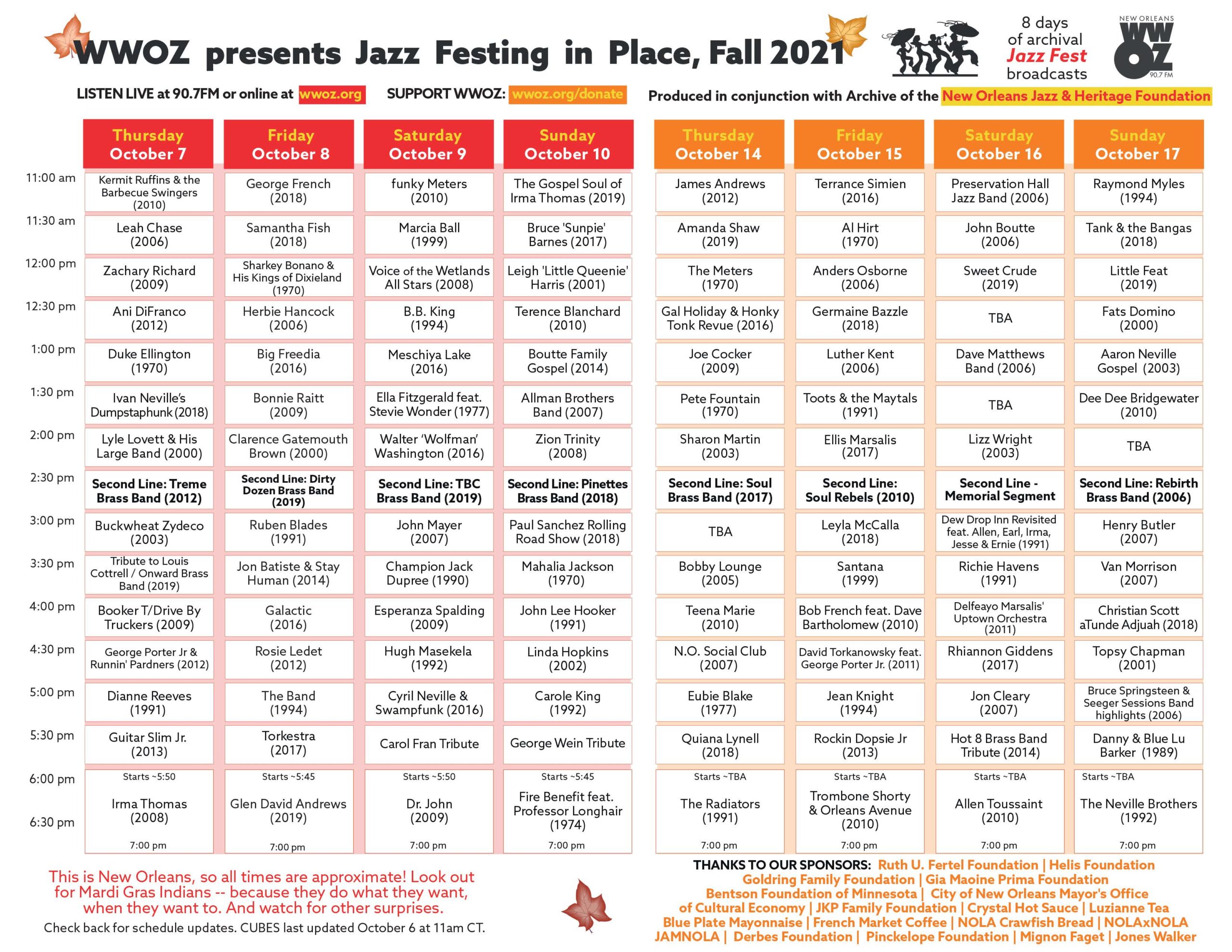 The schedule for the October 2021 edition of Jazz Festing In Place has been announced by WWOZ. In lieu of Jazz Fest, which was canceled for this fall after being rescheduled from the spring following a surge of COVID-19 infections, WWOZ will present archival concert sets from thre past 50 years of the annual music extravaganza. Over the weekends of October 7-10 and 14-17, listeners who tune in to the community radio station from 11 a.m. to 7 p.m. CT will hear more than 120 different classic performances.