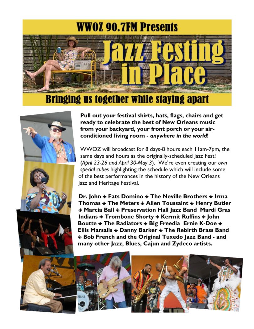 Due to the unprecedented circumstances brought upon by the COVID-19 crisis, WWOZ will bring the New Orleans Jazz and Heritage Festival to everyone’s homes this year during the eight days the event was originally scheduled for. Get ready for eight days of Festin’ brought to your backyard, front porch, bedroom — anywhere (well, almost anywhere). Put on your Jazz Fest shirts, grab your festival essentials, and prepare to celebrate all the wonderful music New Orleans has to offer.