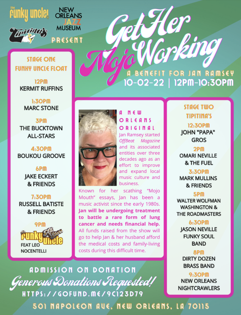 The Funky Uncle, New Orleans Jazz Museum, and Tipitina’s are proudly sponsoring a benefit to get the mojo working for OffBeat editor, Jan Ramsey, who has been diagnosed with a rare form of lung cancer and needs financial help. Join Kermit Ruffins, Leon Nocentelli, Walter “Wolfman” Washington, and more on Sunday, October 2 at Tipitina’s for an all-day event aimed at helping Jan Ramsey. The schedule is as follows: