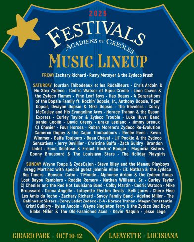 Below is the initial music lineup for the Festivals Acadiens et Créoles 2025 Festival. The full music and event schedule will be released in September 2025. For more information, click here.