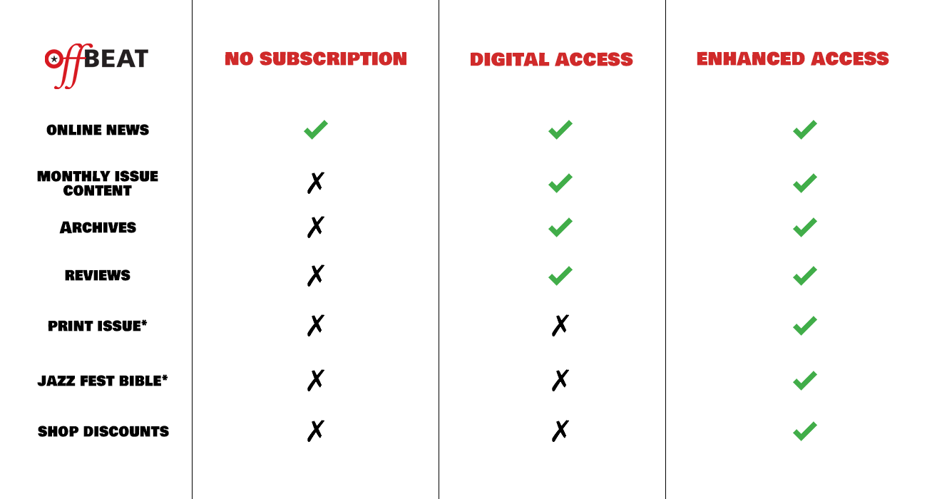 Your subscription keeps OffBeat Magazine and local music alive and kicking!