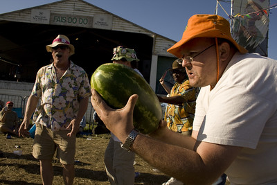 And, after Beau Jocque’s powerhouse set, when the musicians and stagehands paused to watch the saga of the “Watermelon Ritual” as it unfolded in front of the stage. The High Priest heaved his melon skyward at the culmination of the march; it shattered on the earth and the celebrants fell upon it, devouring the red flesh that wasn’t tainted with dirt.
