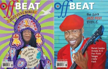 OffBeat Jazz Fest Bible 2013 cover illustration combo pack Includes Limited Edition 12″ X 18″ lithographs of Big Chief Monk Boudreaux and Walter “Wolfman” Washington numbered and signed by artist Karen Ocker