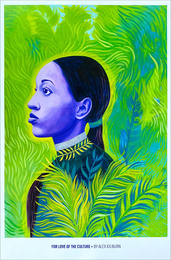 This poster by painter Alex Kilburn portrays Queen Tahj from the Uptown Mardi Gras Indian Tribe, The Golden Eagles.